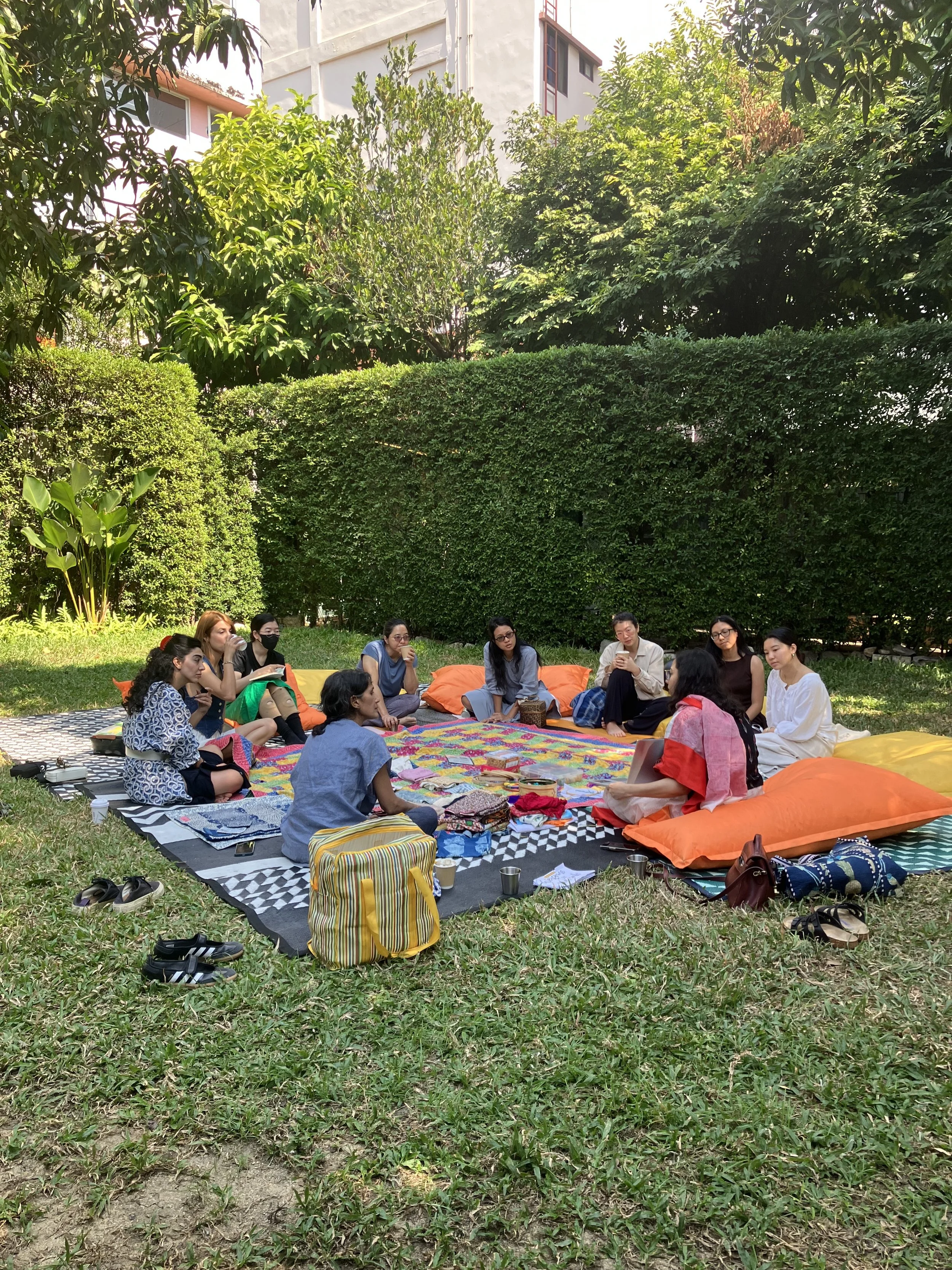 This stitching circle held at Bangkok 1899’s garden was a morning of learning the histories of embroidery and textiles from India, Northern Thailand and Laos with our facilitators Rubina from Rafunaama and Rachna from Tikkiwallah. The workshop ended with the stitching session, inviting participants to weave together the histories they carry and the futures they imagine. It was a beautiful morning of collective making and shared reflection.